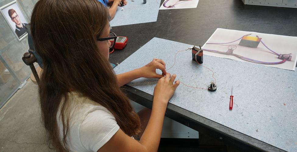 An einer weiteren Station durfte jeder von uns seinen eigenen Stromkreis bauen. Jeder bekam eine Batterie, zwei Klemmen, einen Schalter, eine Lampe, drei Stück Kabel und ein Bild als Vorlage. Dann ging es los!