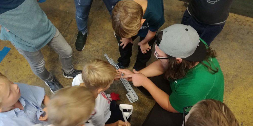 Nach der Verabschiedung von unseren Eltern durften wir direkt mit Thomas durch die erste Produktionshalle zur Lehrwerkstatt laufen. Dort war schon alles perfekt vorbereitet. An vier verschiedenen Stationen führten mit uns die Lehrlinge Christoph, Phyllis, Rebecca und Dogukan Experimente durch. Dabei lernten wir, wie Dinge, die in der Natur sehr gut funktionieren auf die Technik übertragen werden können (Bionik). Wir lernten z.B. etwas Anwendungen im Leichtbau oder bei Oberflächen (Lotuseffekt). Hier konnten wir sogar mit Wachs und Wasser experimentieren.