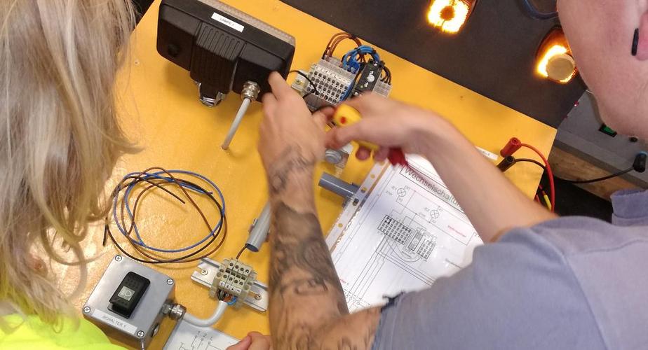 Wir wurden in kleine Gruppen aufgeteilt und starteten an den verschiedenen Stationen. Meine erste Station war die Elektroabteilung. Lehrlinge des 4 Lehrjahres haben schon auf uns gewartet. Jeder hatte seinen eigenen Versuchsaufbau. Kabel mussten ab isoliert und verlegt werden. Wenn dann noch alles richtig angeschlossen wurde, sollte uns ein Licht aufgehen. Geklappt!