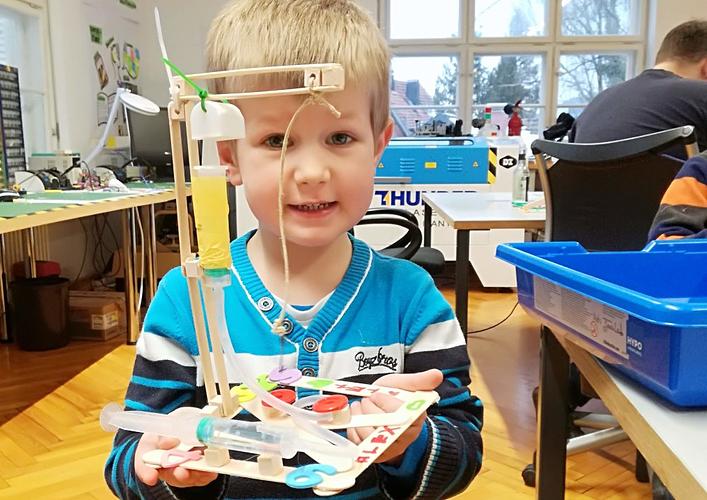 Unser erstes Hydraulik Projekt war toll. Es war interessant für die Kinder greifbar die Funktionsweise zu erleben. Die meisten haben einen Kran gebaut und gleich ausprobiert. Natürlich das Dekorieren war hier wieder wichtig. :-)