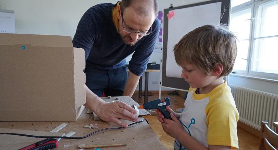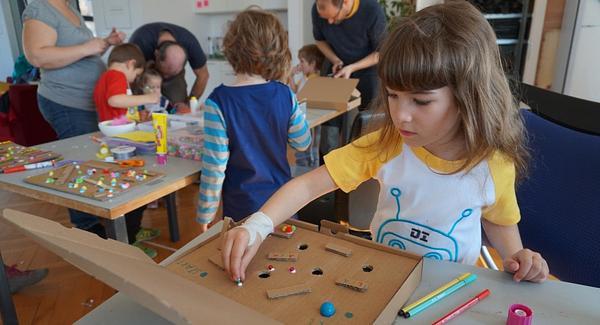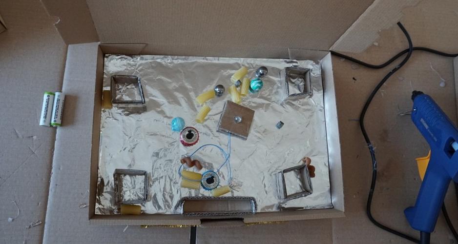 Wir bastelten uns ein Murmel-Labyrinth. Mit Karton und Heißkleber bauten wir die Basis, die dann wie ein kleiner Koffer aussah. Im Koffer offenbarte sich dann das Labyrinth, das wir mit Gängen, Hindernissen und Fallen fantasievoll im passenden Schwierigkeitsgrad gestaltet haben. Und in der Ebene darunter, wo die Murmel reinfällt, bastelten wir eine kleine Geräusch- und Lichtanlage, welche dem Labyrinth noch extra Leben einhaucht. Das Murmel-Abenteuer kann dann beginnen!